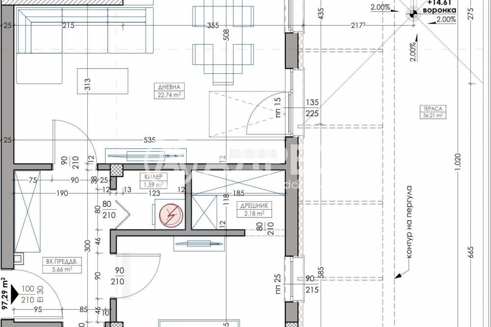 Апартамент – Дневна с кухненски бокс, спалня, баня с тоалетна, килер, коридор, балкон. Имотът е с обща площ 87,39 кв.м, което включва 74 кв. м чиста площ и 13,39 кв.м общи части.