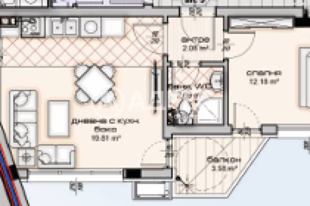 Функционален двустаен апартамент, със следното разпределение : коридор дневна с кухненска част, спалня, баня с тоалет и тераса. Към апартамента може да се закупи паркомясто или гараж.