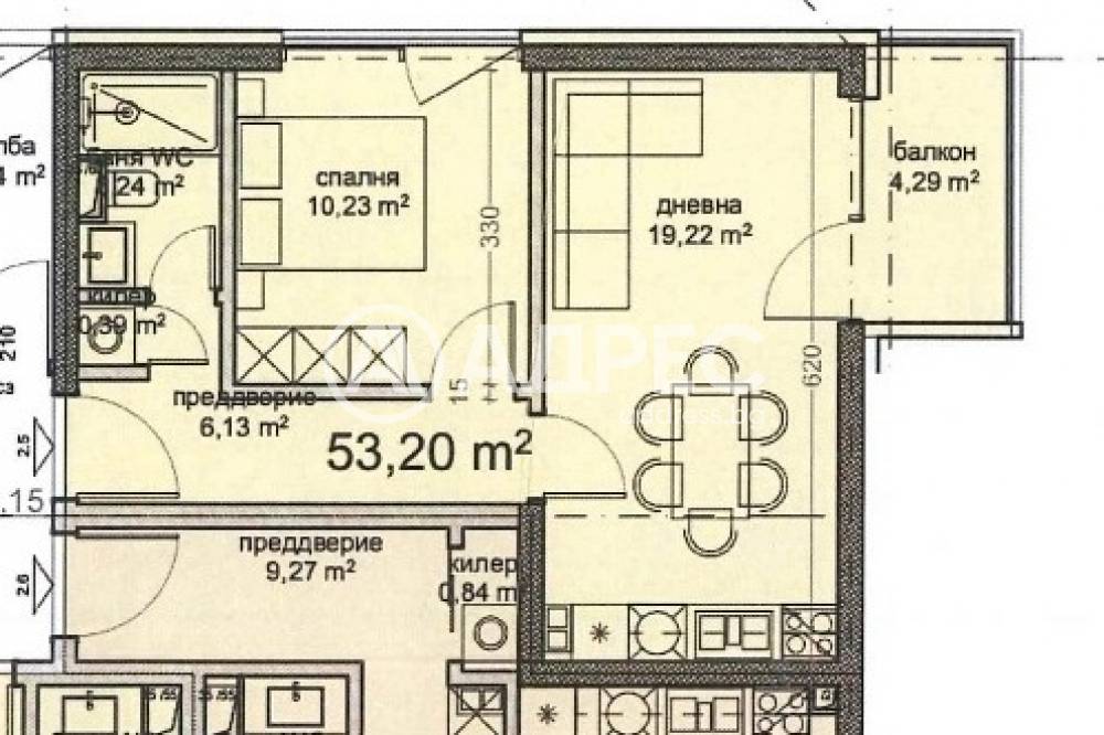 Чудесен двустаен апартамент с хубава дневна с кухненска част, спалня, коридор, перално, обща баня с тоалет и една голяма тераса на дневната.