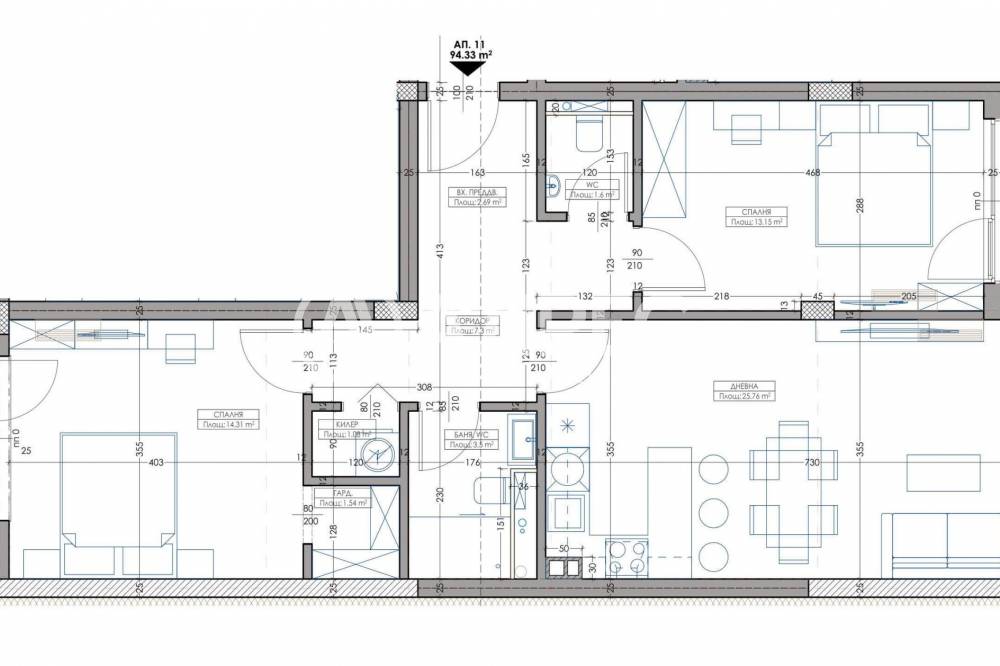 Апартамент – Дневна с кухненски бокс, 2 спални, баня с тоалетна, тоалетна, килер, гардероб, коридор, входно преддверие, тераса, лоджиа. Имотът е с обща площ 112,96 кв.м, което включва 94,33 кв. м чиста площ и 18,63 кв.м общи части.