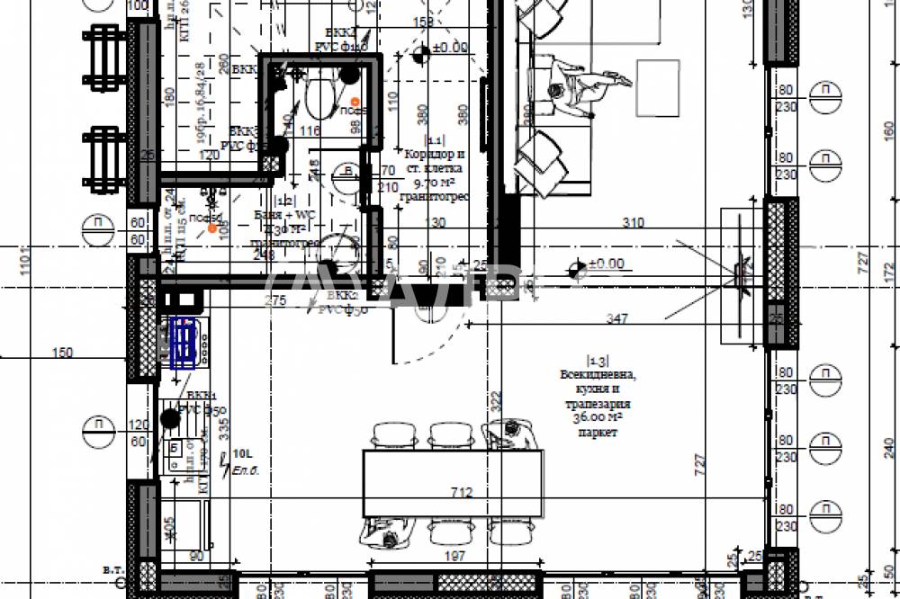 ет. 1 - Дневен тракт, баня с тоалет, коридор и стълбище към ет.2
