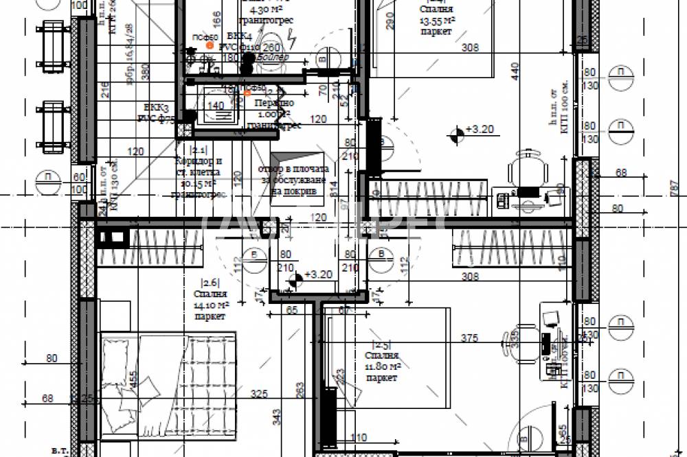 ет. 2 - Три спални, баня с тоалет, перално помещение, стълбище и балкон