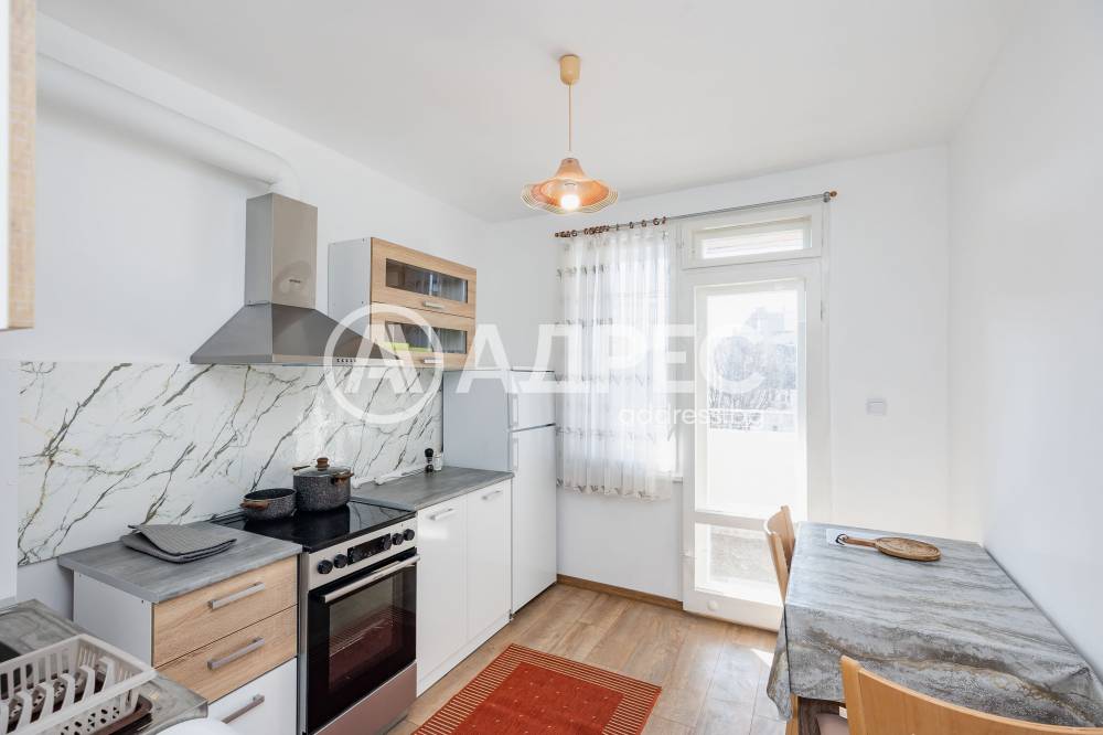 Тристаен маломерен апартамент след пълен ремонт, с чисто ново обзавеждане във всички помещения. Състои се от три отделни стаи: слънчев южен хол с площ 23 кв.м, кухня с площ от 9 кв.м, спалня с площ от 15 кв.м, която гледа към тиха озеленена улица. Апартаментът има тераса тип лоджия с хубава гледка.