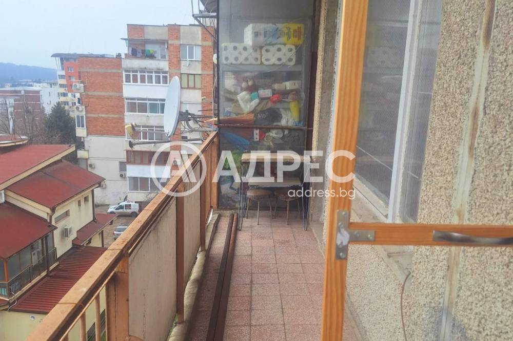Двустаен апартамент. Адрес недвижими имоти продава двустаен апартамент, с площ 62 кв. м. Жилището е разположено на пети, предпоследен етаж, в сграда с асансьор. Състои се от кухня с голяма тераса, хол, спалня, баня, тоалетна, килер. В близост до училище, детска градина хипермаркети и ресторанти.