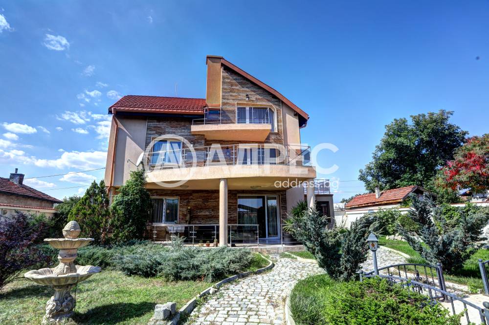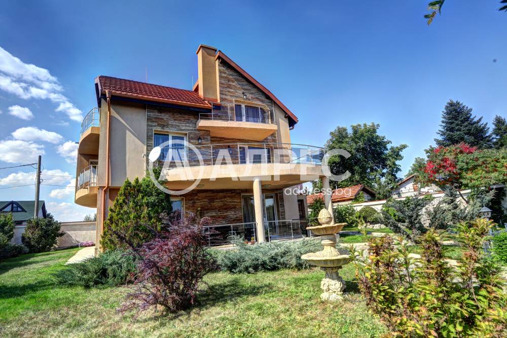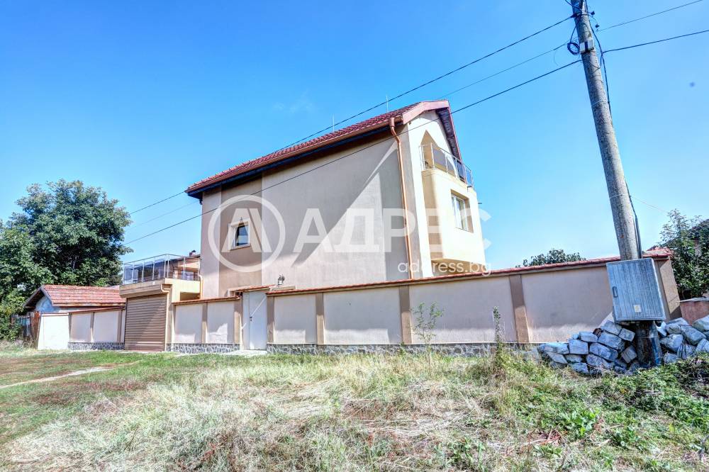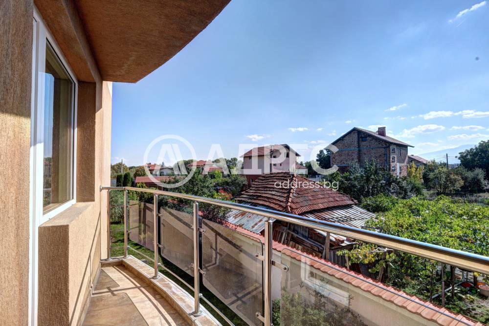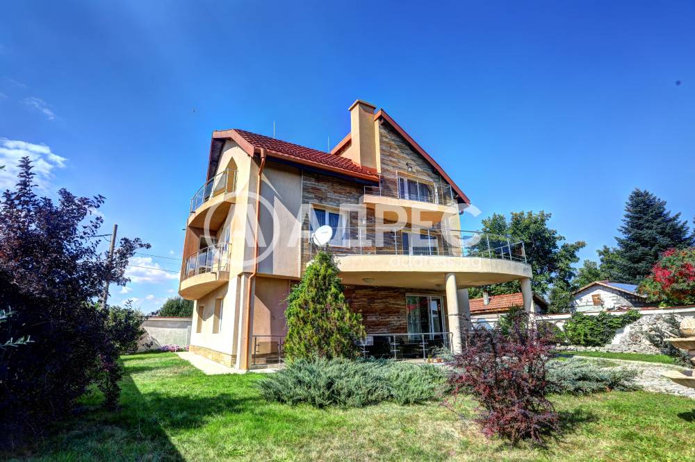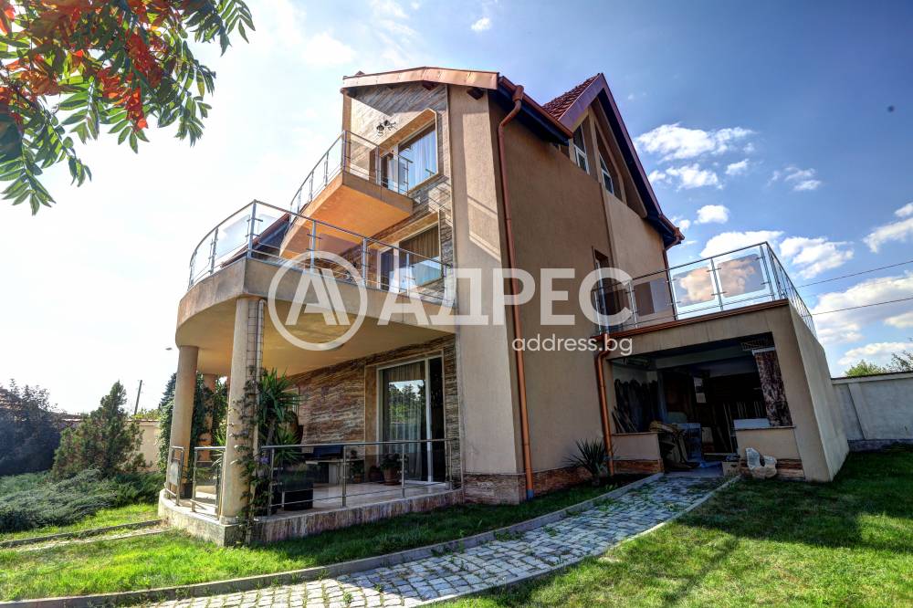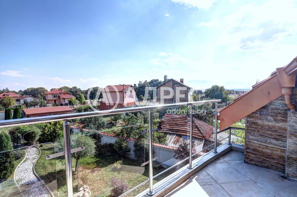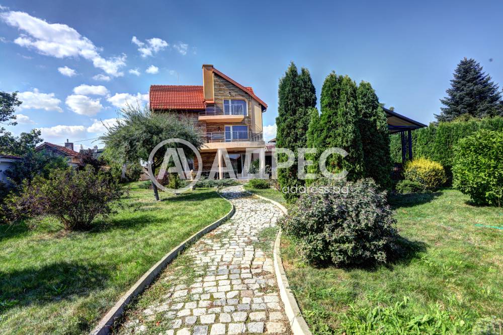 Нова модерна къща с прекрасен двор, в страни от динамиката на големия град и всъщото време близо до него. Разпределението на къщата е съобразено с изискванията за удобство и постигане на максимален комфорт, съчетано със стили високо качество. Партерен етаж: антре, дневна с кухненска част, спалня за гости и баня с тоалетна. Втори етаж: три спални с тераси и две бани, с изложениеюг и изток. Трети етаж: спалня с източна тераса, баня и второ помещение с площ от близо 30 кв.м., в което може да се обособи дрешник и кабинет. Отоплението се осъществява чрез камина с водна риза. Подовете са от египетски мрамор, а стените от минерална мазилка. Изградена е и модерна поливна система.