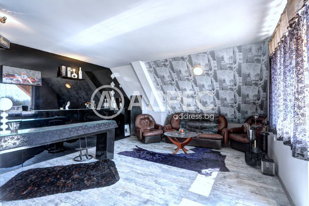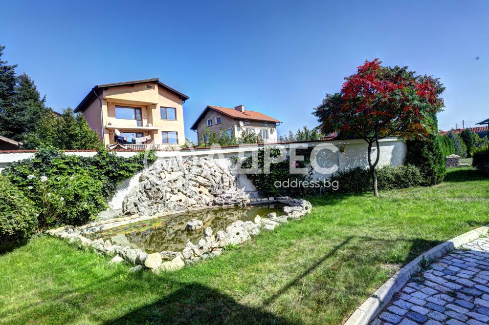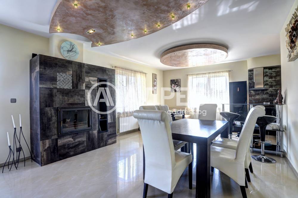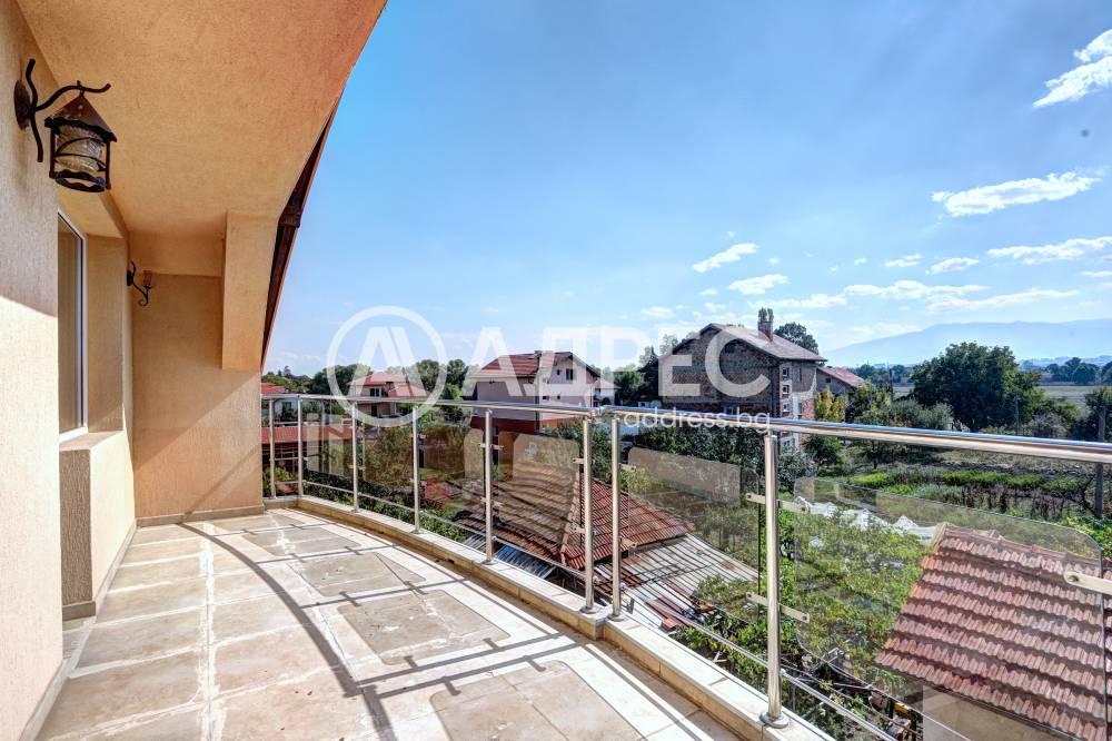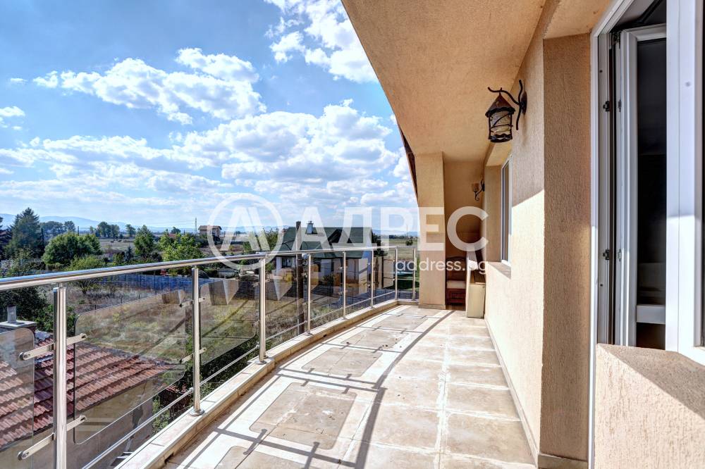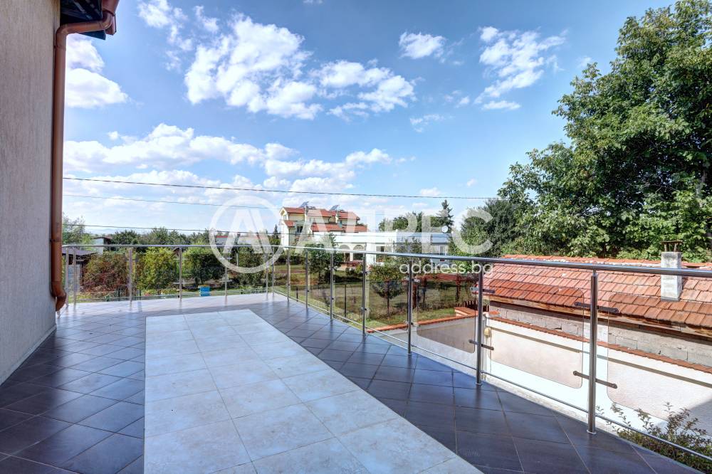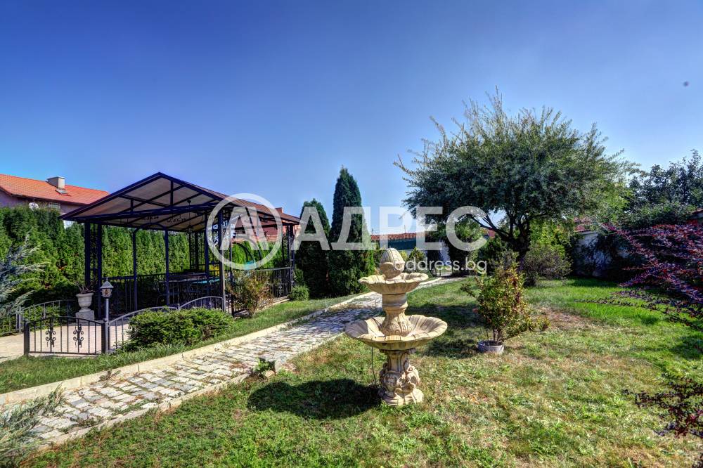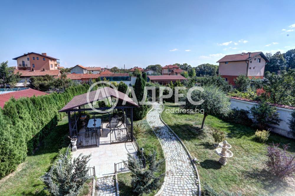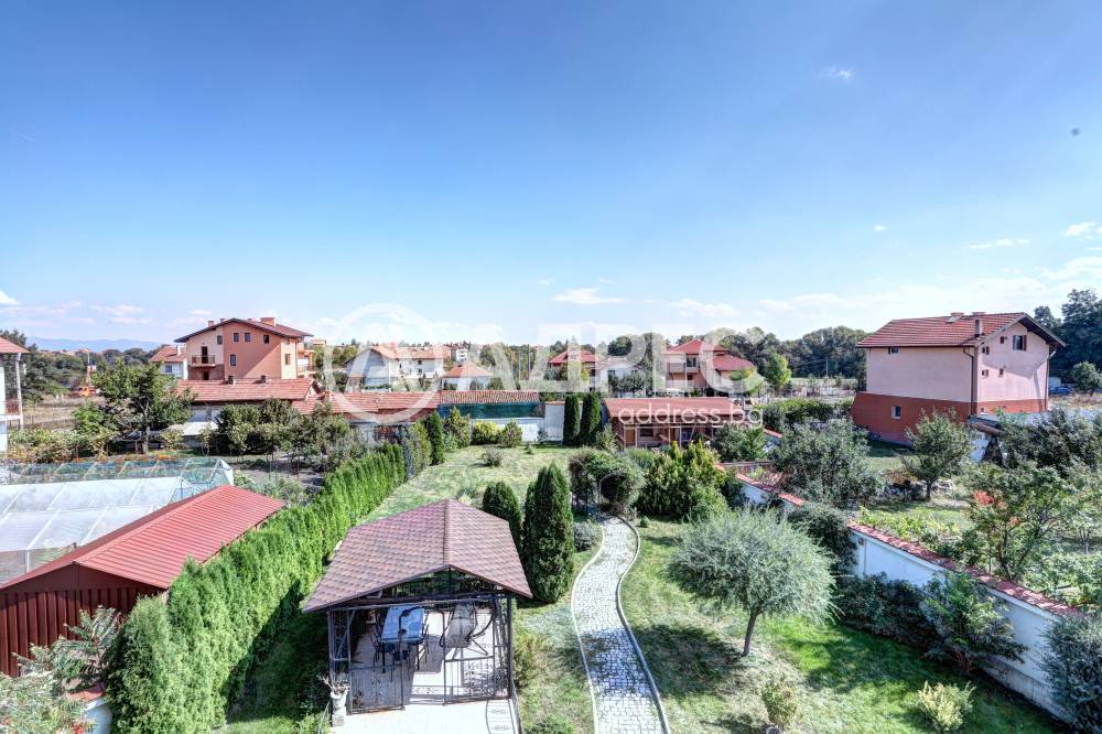 Нова модерна къща с прекрасен двор, в страни от динамиката на големия град и всъщото време близо до него. Разпределението на къщата е съобразено с изискванията за удобство и постигане на максимален комфорт, съчетано със стили високо качество. Партерен етаж: антре, дневна с кухненска част, спалня за гости и баня с тоалетна. Втори етаж: три спални с тераси и две бани, с изложениеюг и изток. Трети етаж: спалня с източна тераса, баня и второ помещение с площ от близо 30 кв.м., в което може да се обособи дрешник и кабинет. Отоплението се осъществява чрез камина с водна риза. Подовете са от египетски мрамор, а стените от минерална мазилка. Изградена е и модерна поливна система.