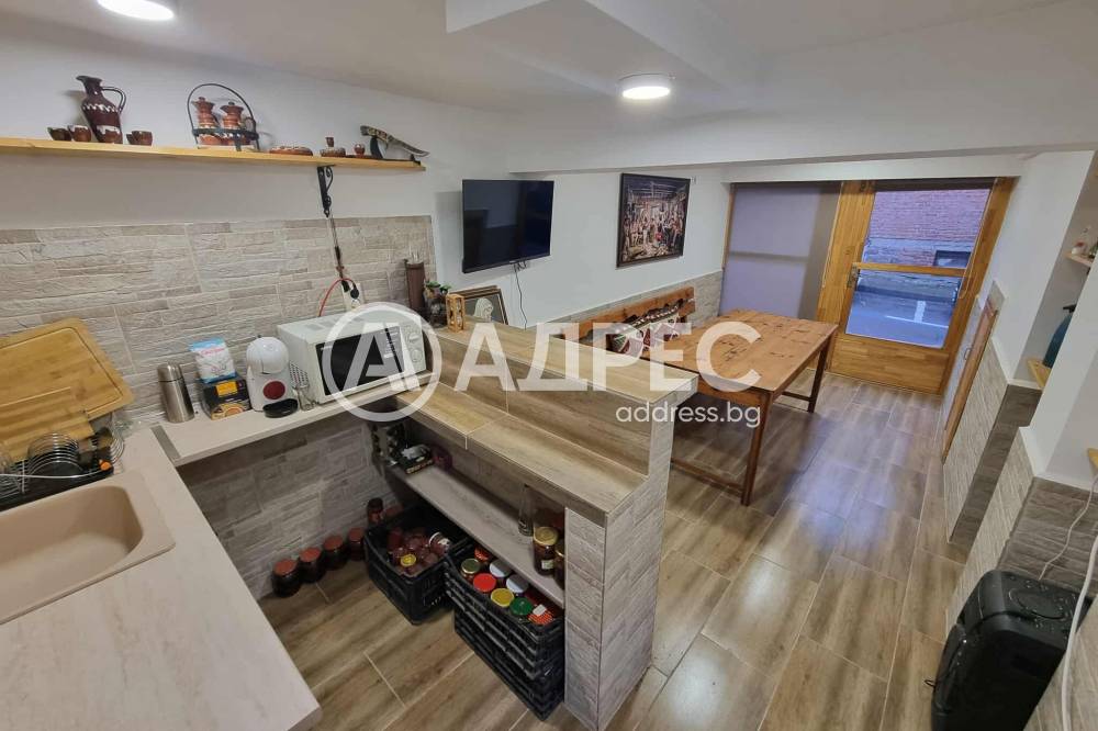 Разполага с два входа, което дава възможност за обособяване на две по малки жилища. Към имота има още приземен етаж 1/2 от 58 кв.м., състоящ се от две стаи, баня и кухня. Дворното място е 1/2 идеални части от 180 кв.м. в което има ГАРАЖ от 17 кв.м., който е превърнат в модерна битова стая, работилница и допълнителни постройки.