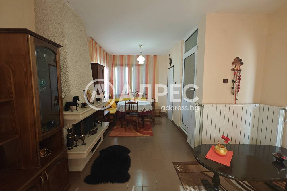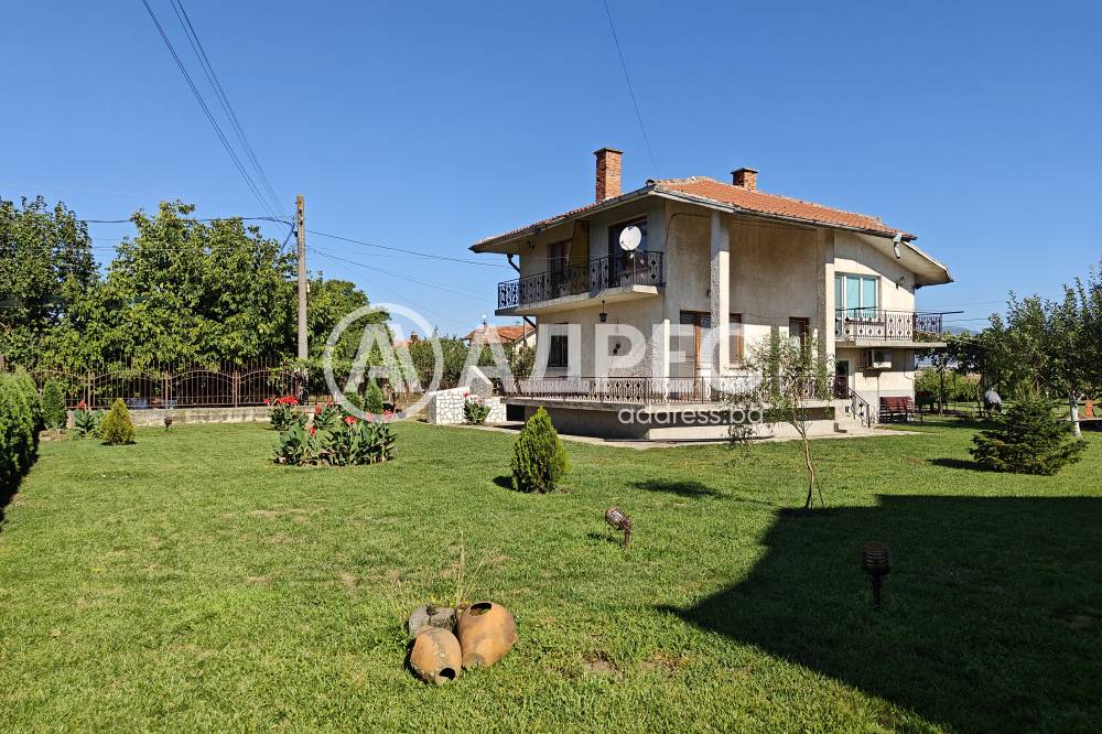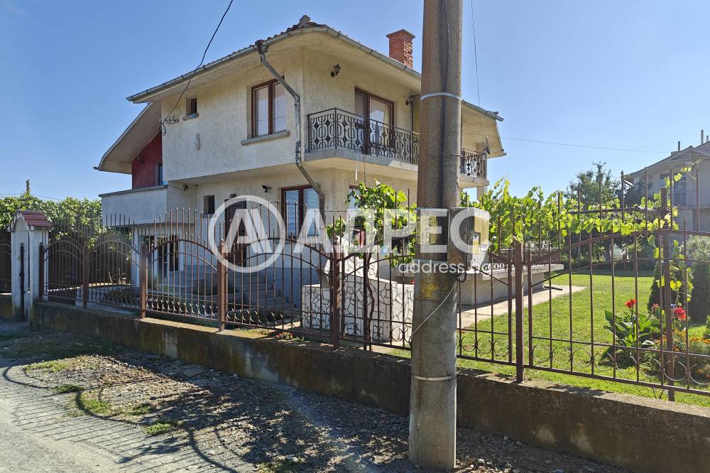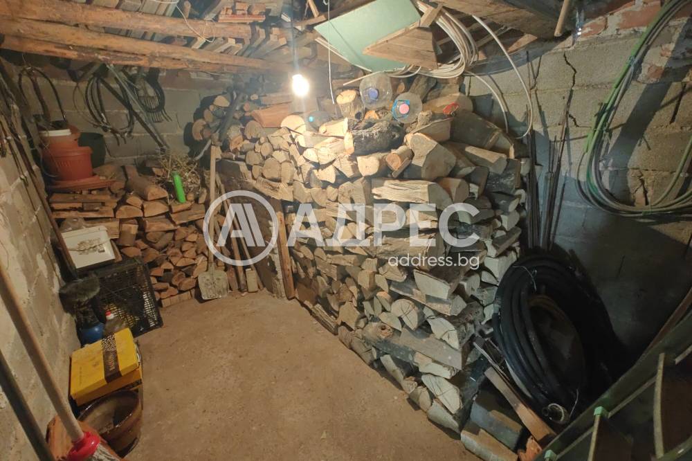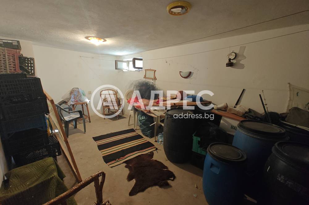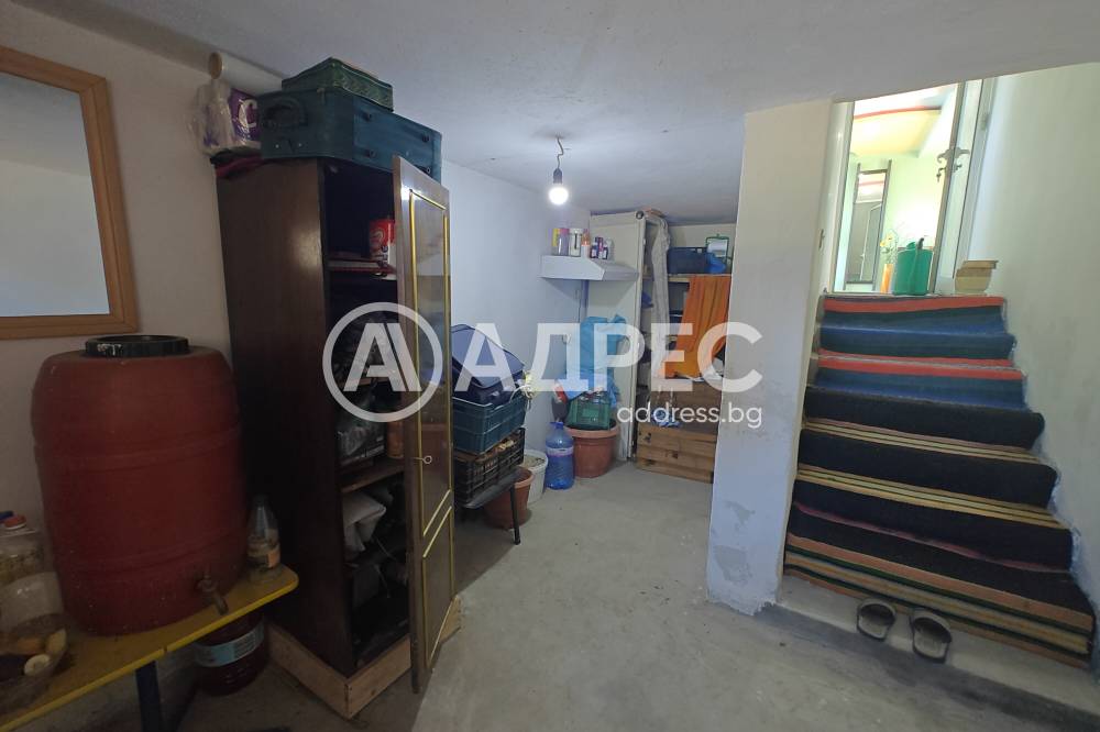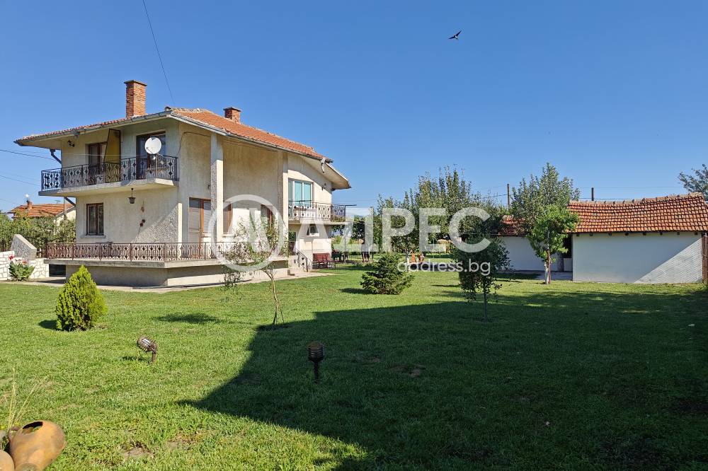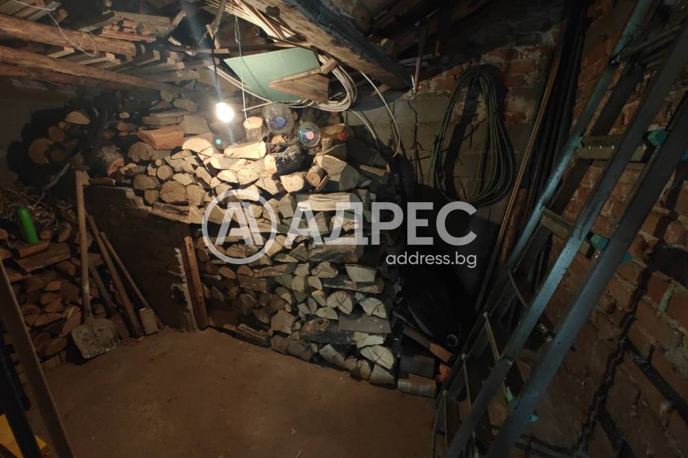 АДРЕС ПРОДАВА: Тухлена КЪЩА с разгъната застроена площ от 210 кв.м., разположена върху обширен и добре поддържан двор от 1400 кв.м. Имотът има следното разпределение: на първия етаж са ситуирани хол с кухненски бокс и санитарен възел, като към жилищната част е присъединен и гараж, преустроен във всекидневна. Чрез вътрешно стълбище се достига до втория и третия етаж, където са обособени пет самостоятелни спални, всяка с излаз на собствена тераса, както и едно общо санитарно помещение. Връзка със стълбище води и към избено помещение, което може да служи както за склад, така и да бъде пригодено за допълнителна стая.