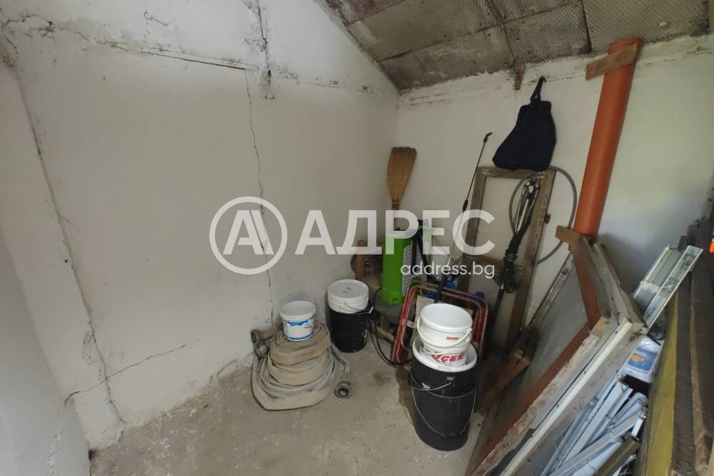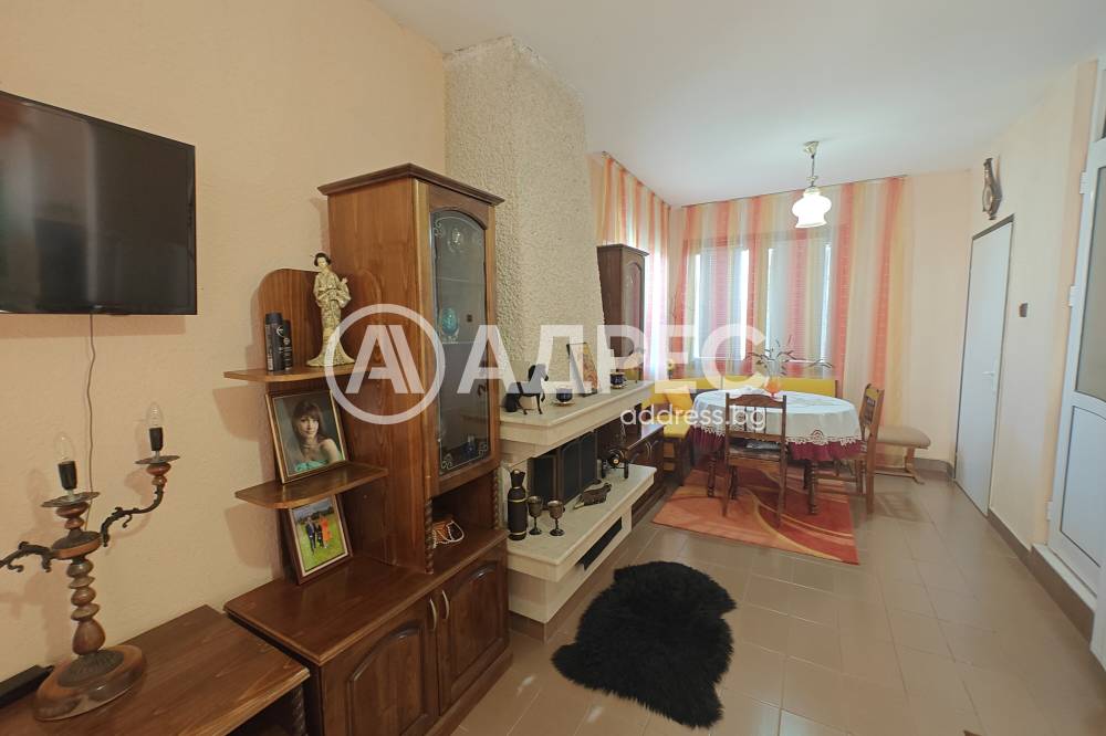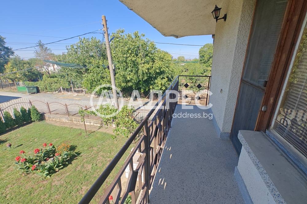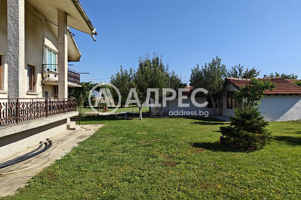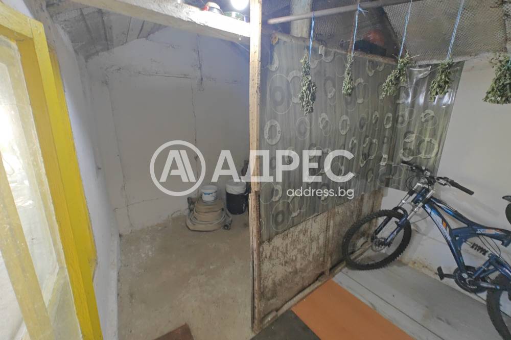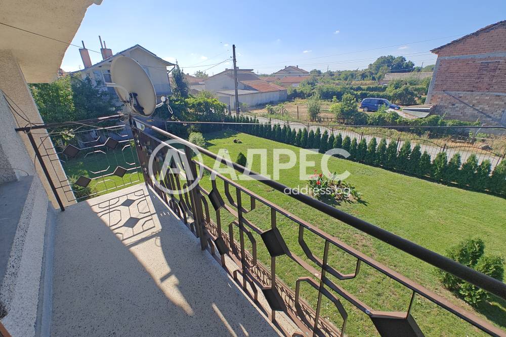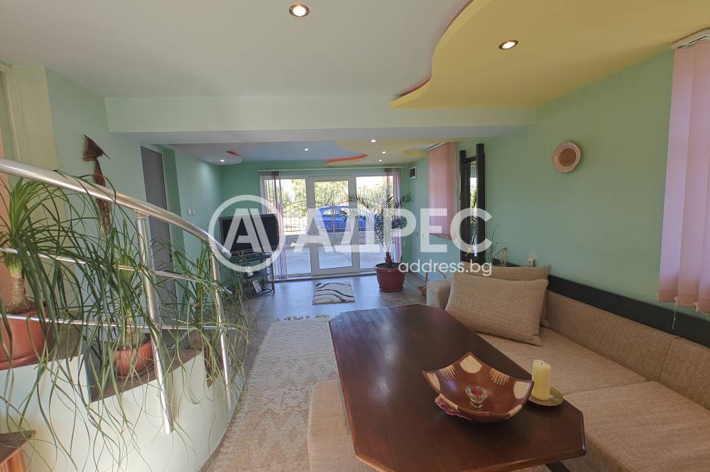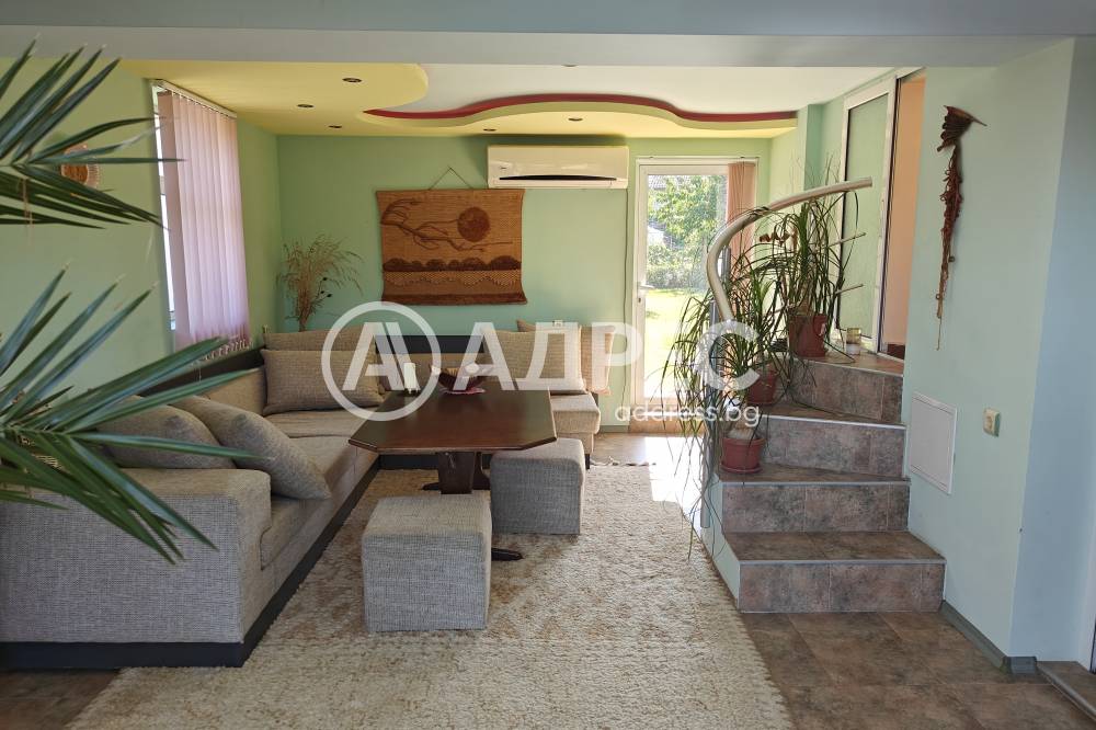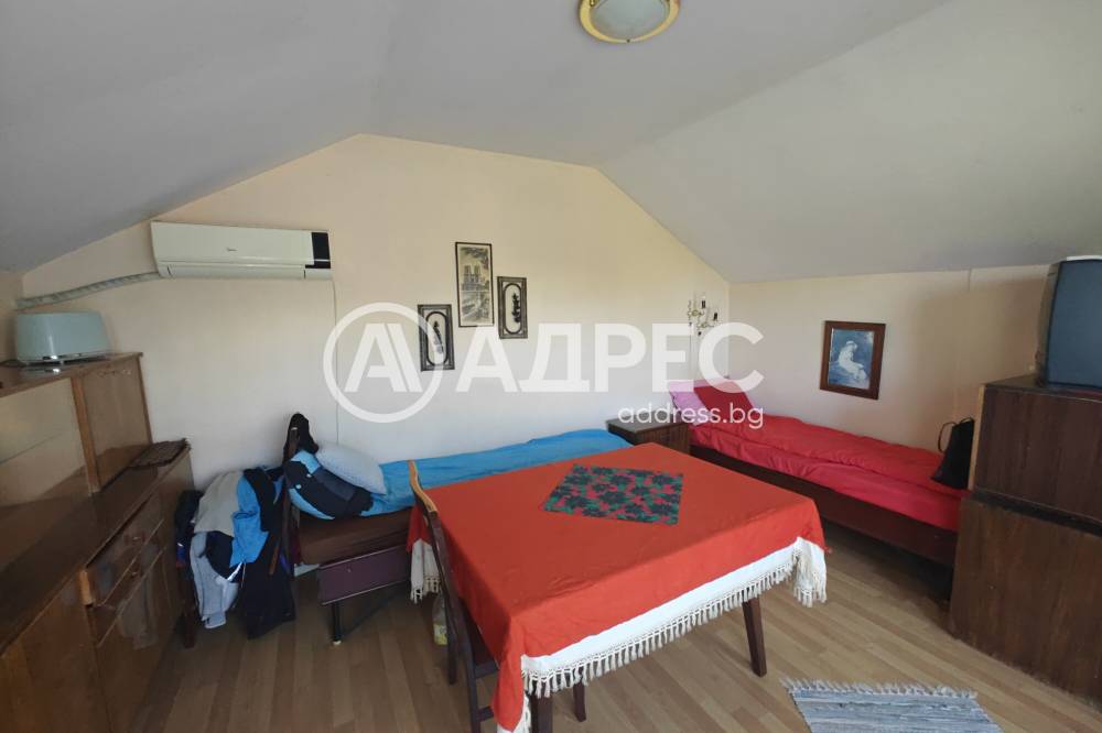 АДРЕС ПРОДАВА: Тухлена КЪЩА с разгъната застроена площ от 210 кв.м., разположена върху обширен и добре поддържан двор от 1400 кв.м. Имотът има следното разпределение: на първия етаж са ситуирани хол с кухненски бокс и санитарен възел, като към жилищната част е присъединен и гараж, преустроен във всекидневна. Чрез вътрешно стълбище се достига до втория и третия етаж, където са обособени пет самостоятелни спални, всяка с излаз на собствена тераса, както и едно общо санитарно помещение. Връзка със стълбище води и към избено помещение, което може да служи както за склад, така и да бъде пригодено за допълнителна стая.