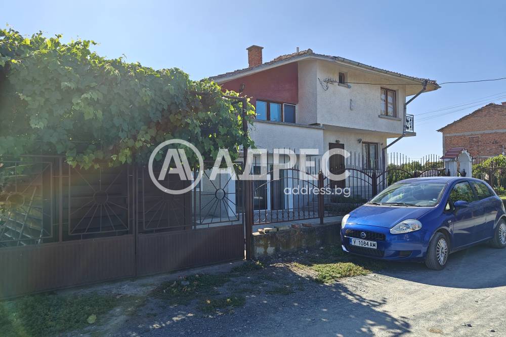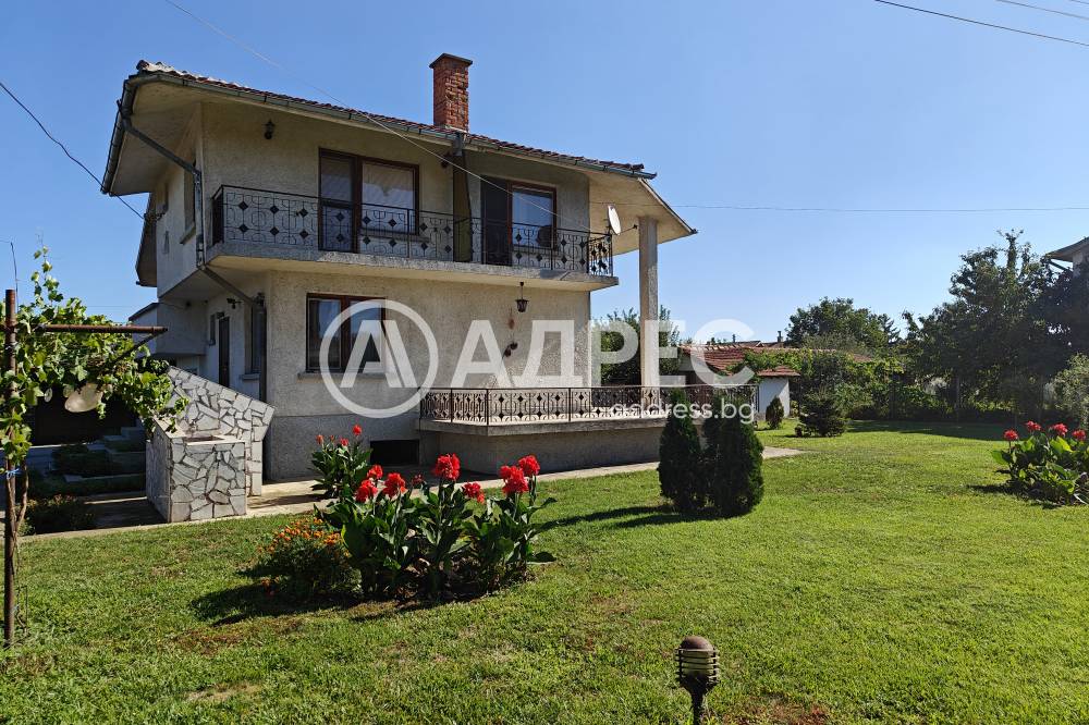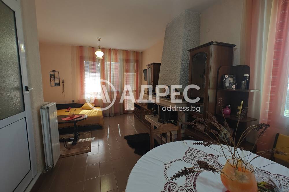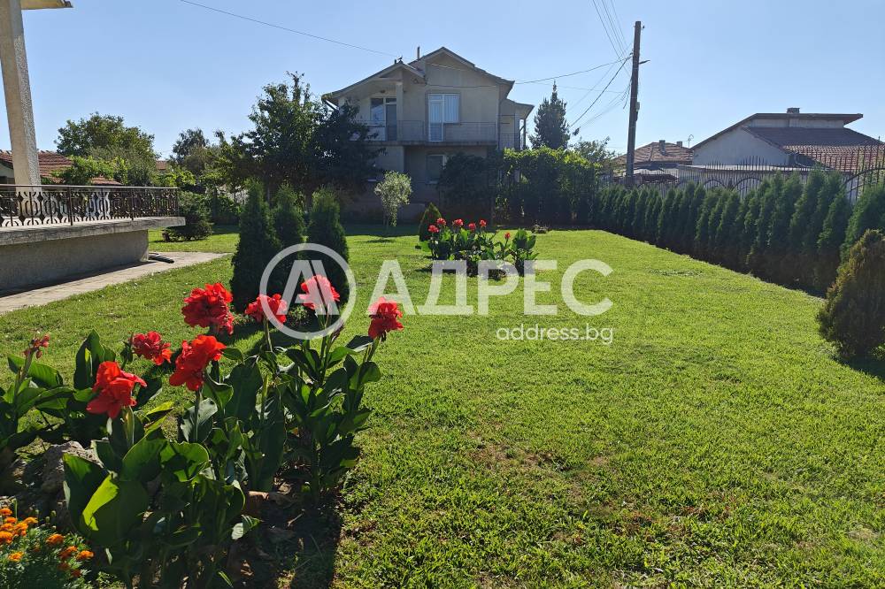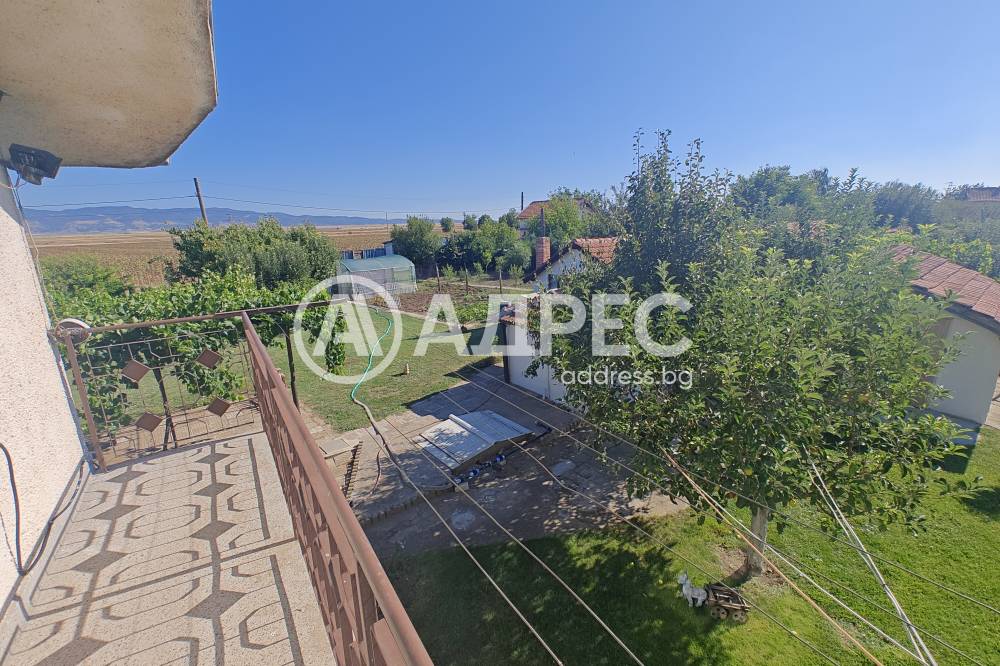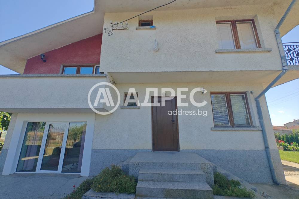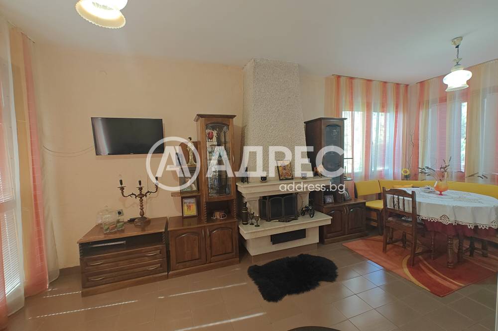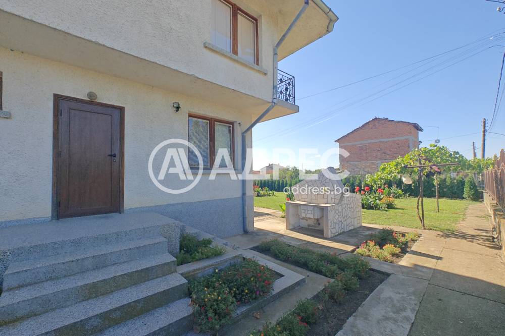 АДРЕС ПРОДАВА: Тухлена КЪЩА с разгъната застроена площ от 210 кв.м., разположена върху обширен и добре поддържан двор от 1400 кв.м. Имотът има следното разпределение: на първия етаж са ситуирани хол с кухненски бокс и санитарен възел, като към жилищната част е присъединен и гараж, преустроен във всекидневна. Чрез вътрешно стълбище се достига до втория и третия етаж, където са обособени пет самостоятелни спални, всяка с излаз на собствена тераса, както и едно общо санитарно помещение. Връзка със стълбище води и към избено помещение, което може да служи както за склад, така и да бъде пригодено за допълнителна стая.